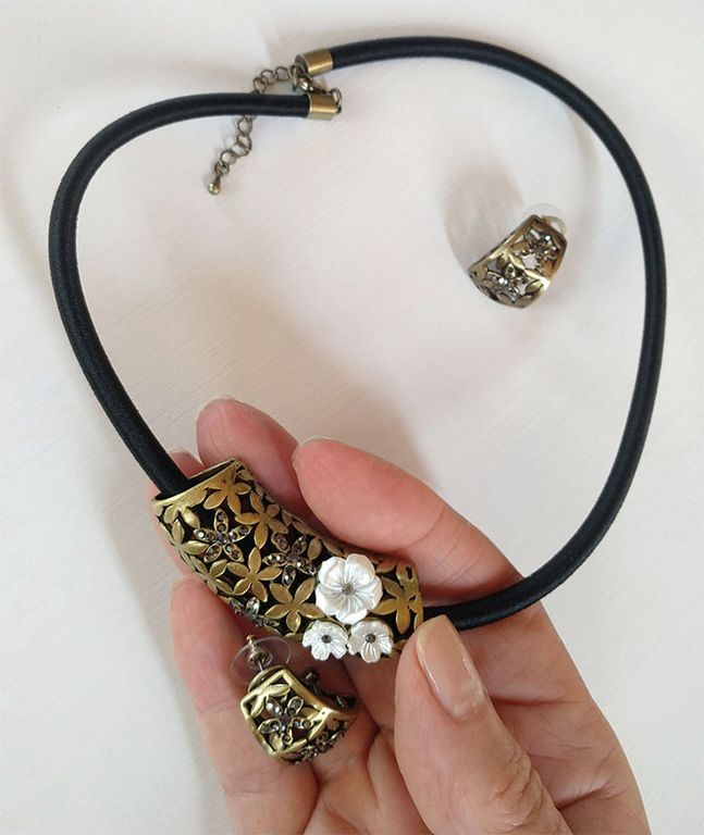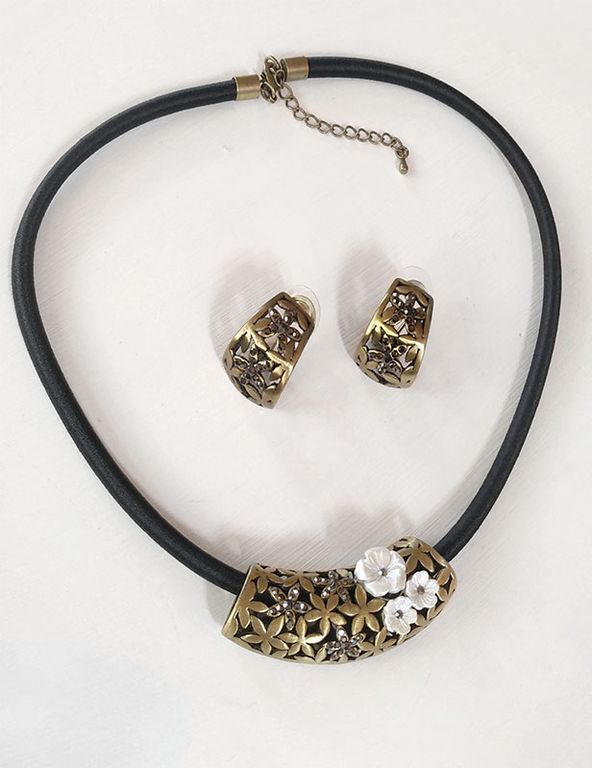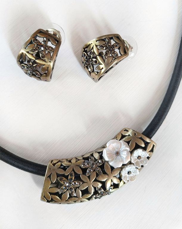 (АРТИКУЛ: 6814/92) КОМПЛЕКТ ЖЕНСКИЙ (КОЛЬЕ+СЕРЬГИ), МЕТАЛЛ "БРОНЗА" , ЧЕРНЫЙ ШНУРОК, ТЕМНЫЕ СТРАЗЫ, МОЛОЧНЫЕ ЦВЕТЫ