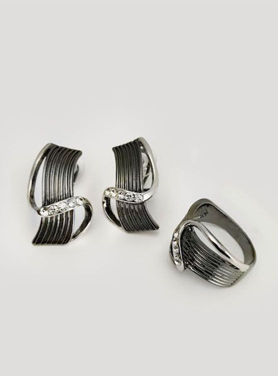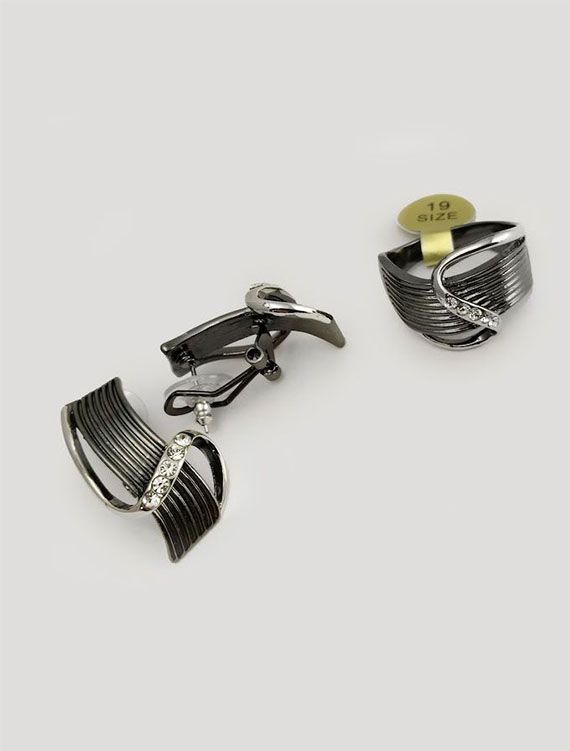 (АРТИКУЛ: 6835/53) КОМПЛЕКТ ЖЕНСКИЙ (СЕРЬГИ+КОЛЬЦО), ТЕМНО-СЕРЫЙ МЕТАЛЛ, СТРАЗЫ