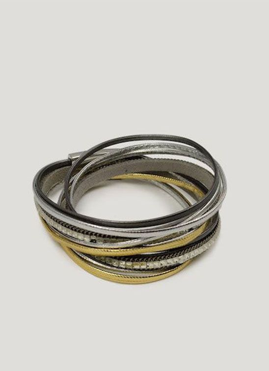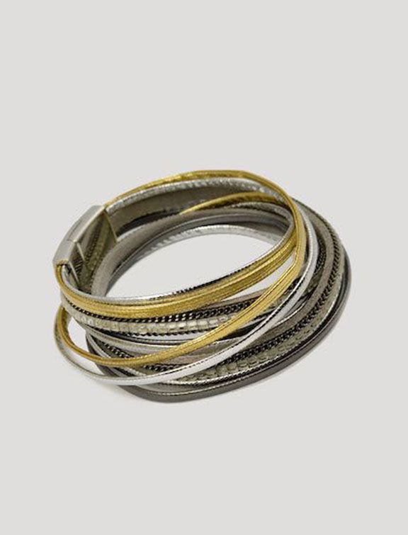 (АРТИКУЛ: 7124/54) БРАСЛЕТ ЖЕНСКИЙ, НАМОТКА, КОЖАНЫЕ НИТИ, МЕТАЛЛ, МАТОВЫЕ СТРАЗЫ, ЦВЕТ "СЕРЕБРО/ ЗОЛОТО/ СЕРЫЙ", НА МАГНИТЕ