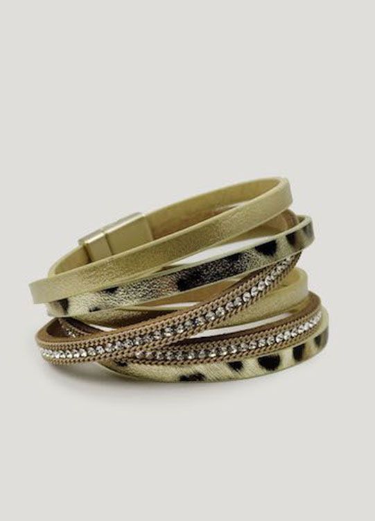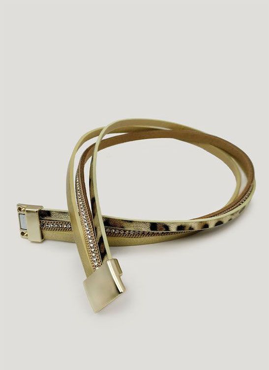 (АРТИКУЛ: 7125/51) БРАСЛЕТ ЖЕНСКИЙ, НАМОТКА, КОЖАНЫЕ НИТИ, МЕТАЛЛ, МЕЛКИЕ СТРАЗЫ, ЦВЕТ "ЗОЛОТИСТЫЙ/ЛЕОПАРД", НА МАГНИТЕ