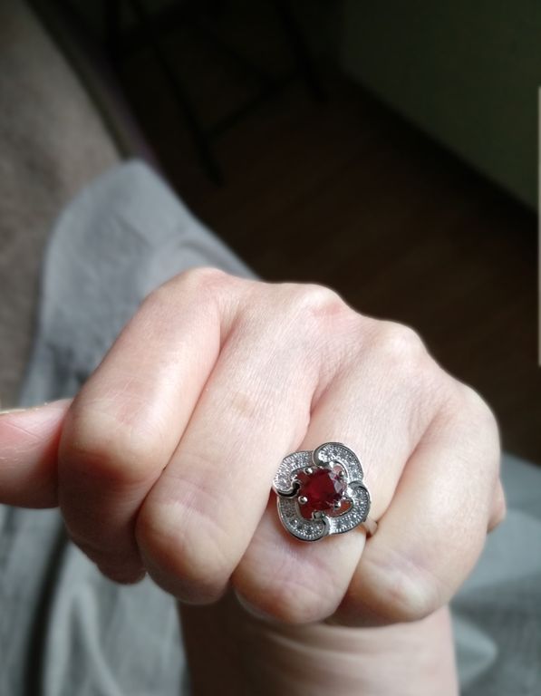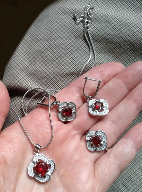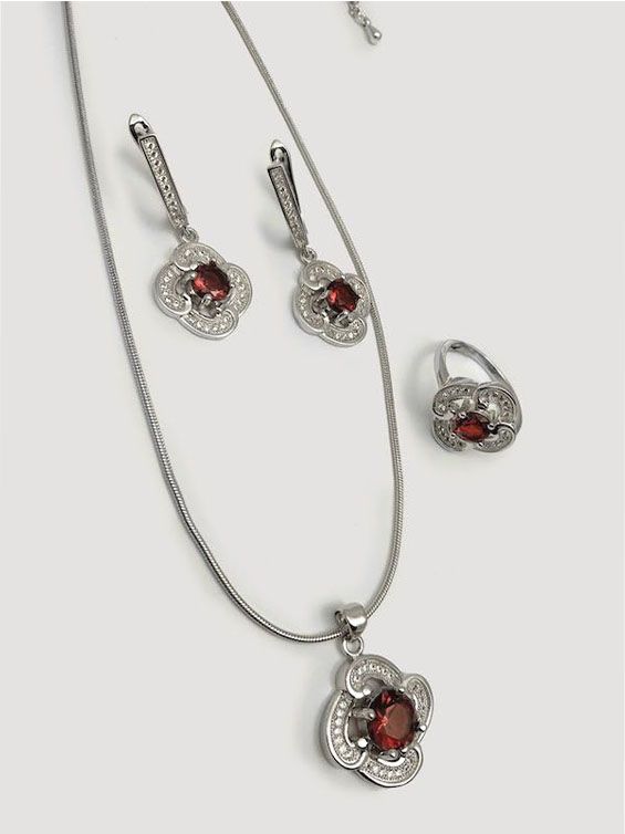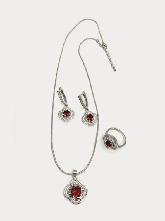 (АРТИКУЛ: 7703/52) КОМПЛЕКТ ЖЕНСКИЙ (КОЛЬЕ + СЕРЬГИ + КОЛЬЦО), МЕТАЛЛ ЦВЕТ "СЕРЕБРО", МЕЛКИЕ СТРАЗЫ, ТЕМНО-КРАСНЫЕ КРИСТАЛЛЫ