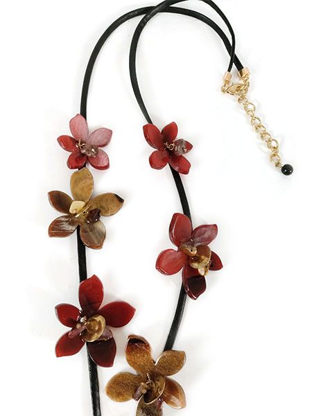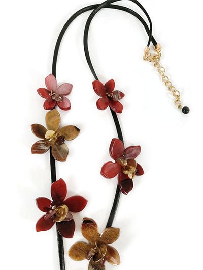 (АРТИКУЛ: 8982/02) КОЛЬЕ ЖЕНСКОЕ, С ПОДВЕСКАМИ "ЦВЕТЫ" В БОРДОВО-БЕЖЕВО-ЗОЛОТИСТЫХ ТОНАХ, ЮВЕЛИРНЫЙ ПЛАСТИК, МЕТАЛЛ, ЧЕРНЫЙ КОЖАНЫЙ ПЛОСКИЙ ШНУРОК