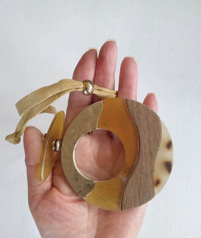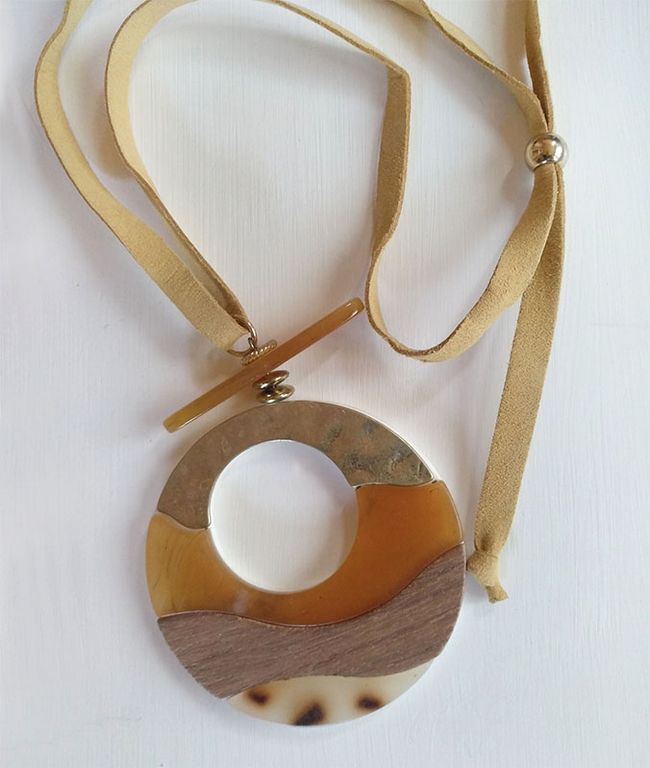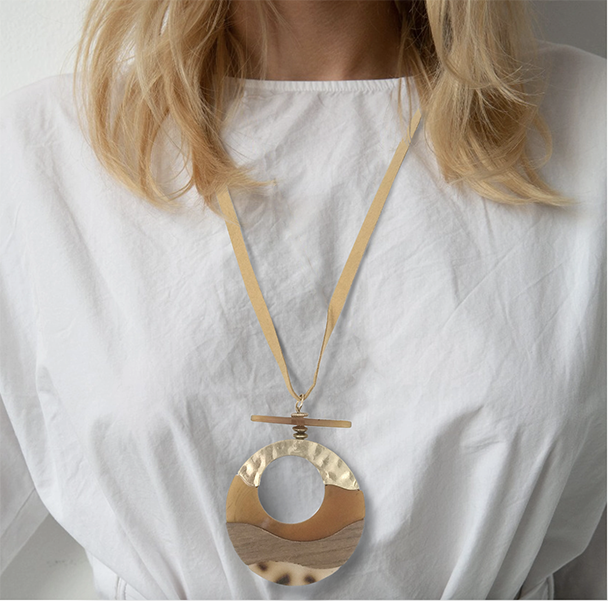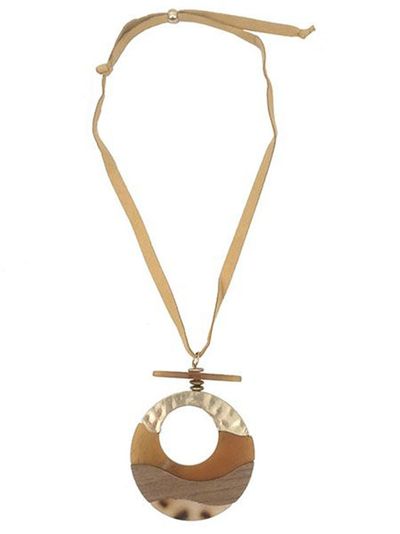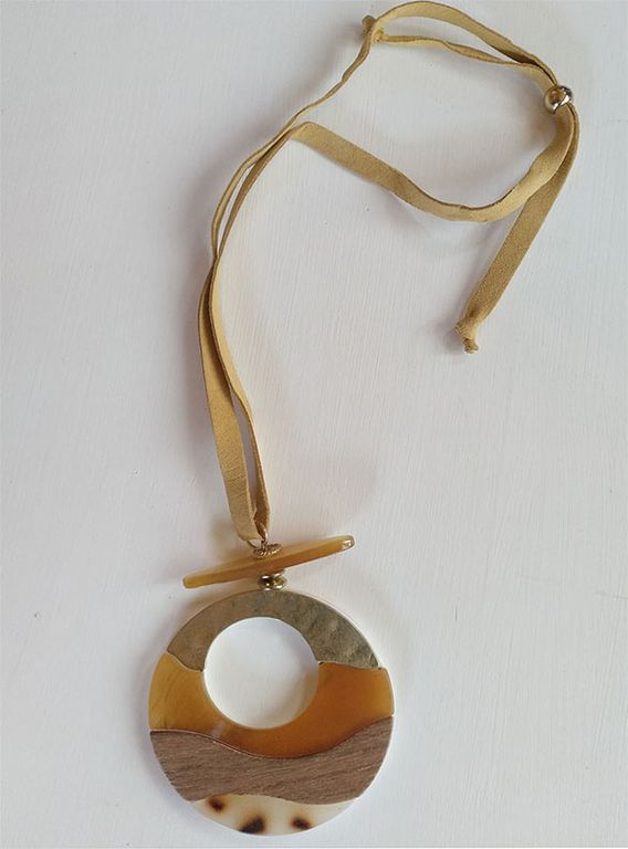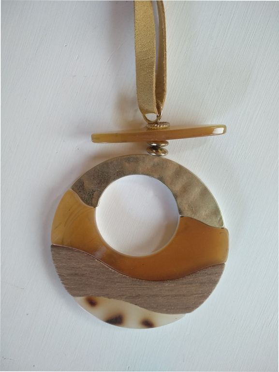 (АРТИКУЛ: 9000/02) КОЛЬЕ ЖЕНСКОЕ, С ПОДВЕСКОЙ В БЕЖЕВЫХ ТОНАХ, ЮВЕЛИРНЫЙ ПЛАСТИК, ЗОЛОТИСТЫЙ МЕТАЛЛ, БЕЖЕВЫЙ КОЖАНЫЙ ПЛОСКИЙ ШНУРОК