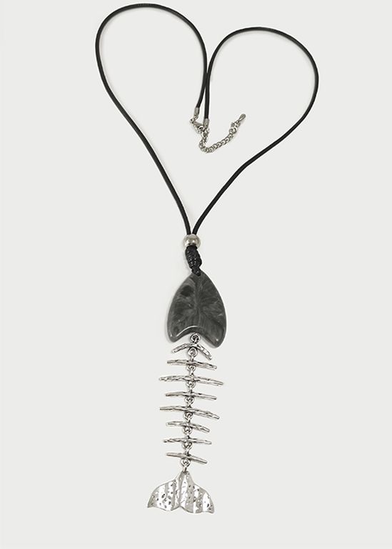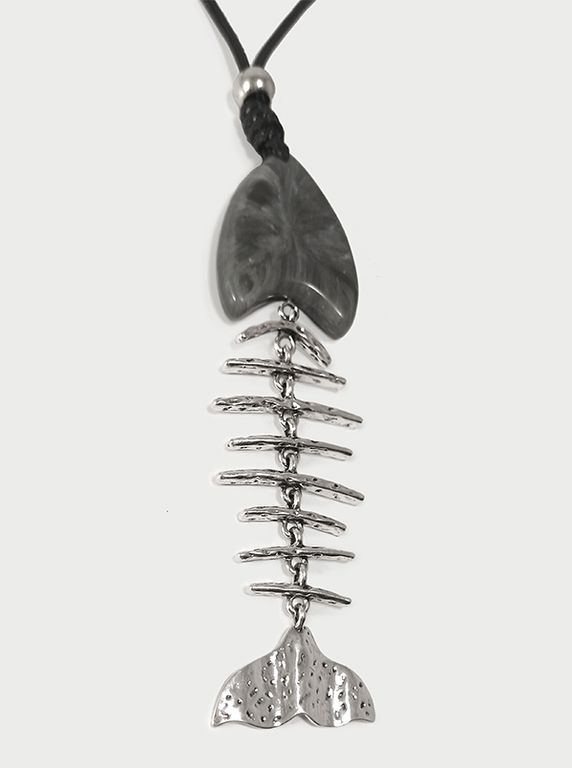 (АРТИКУЛ: 9304/62) КОЛЬЕ ЖЕНСКОЕ, КРУПНАЯ ПОДВЕСКА "СКЕЛЕТ РЫБЫ", СЕРЕБРИСТЫЙ МЕТАЛЛ, СЕРЫЙ ПЛАСТИК (ИМИТАЦИЯ КАМНЯ), НА ЧЕРНОМ ШНУРКЕ
