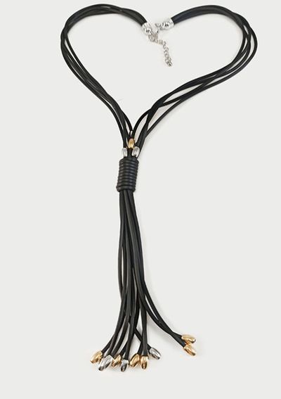 (АРТИКУЛ: 9337/02) КОЛЬЕ ЖЕНСКОЕ, КРУПНАЯ ЗОЛОТИСТО-СЕРЕБРИСТАЯ ПОДВЕСКA, ЧЕРНЫЕ КАУЧУКОВЫЕ ШНУРКИ
