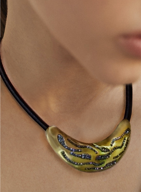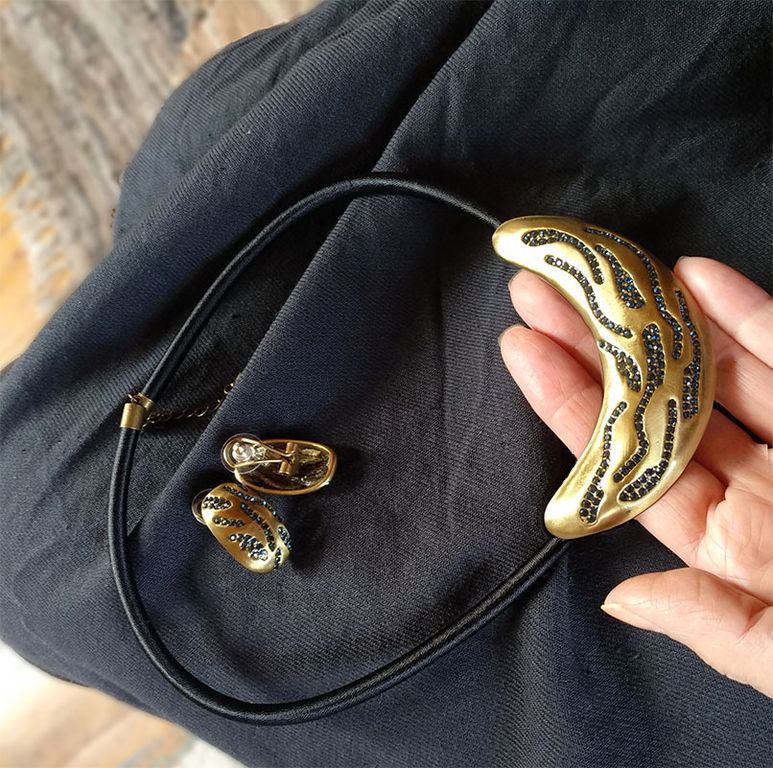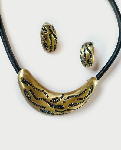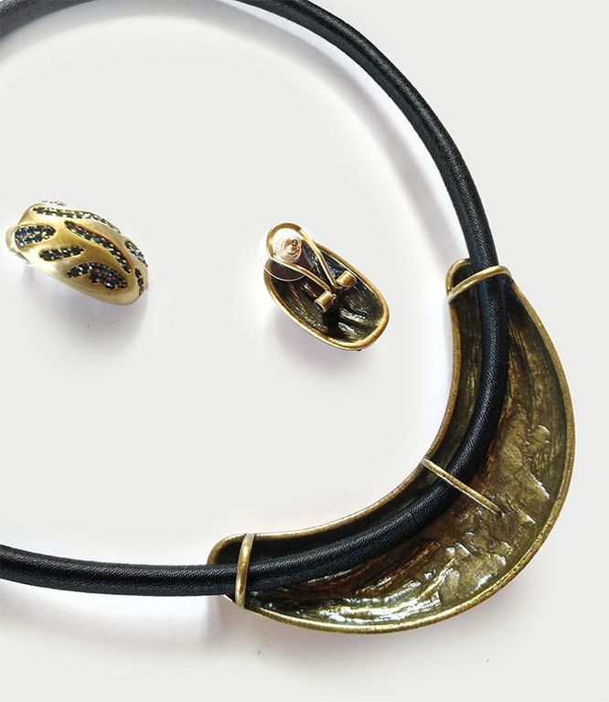 (АРТИКУЛ: 9674/43) КОМПЛЕКТ ЖЕНСКИЙ (КОЛЬЕ+СЕРЬГИ), МЕТАЛЛ "БРОНЗА", ЧЕРНЫЙ ШНУРОК, ТЕМНО-СИНИЕ СТРАЗЫ
